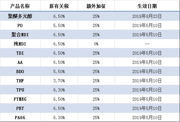表一:美國(guó)對(duì)自中國(guó)進(jìn)口PU原材料額外加征關(guān)稅的情況