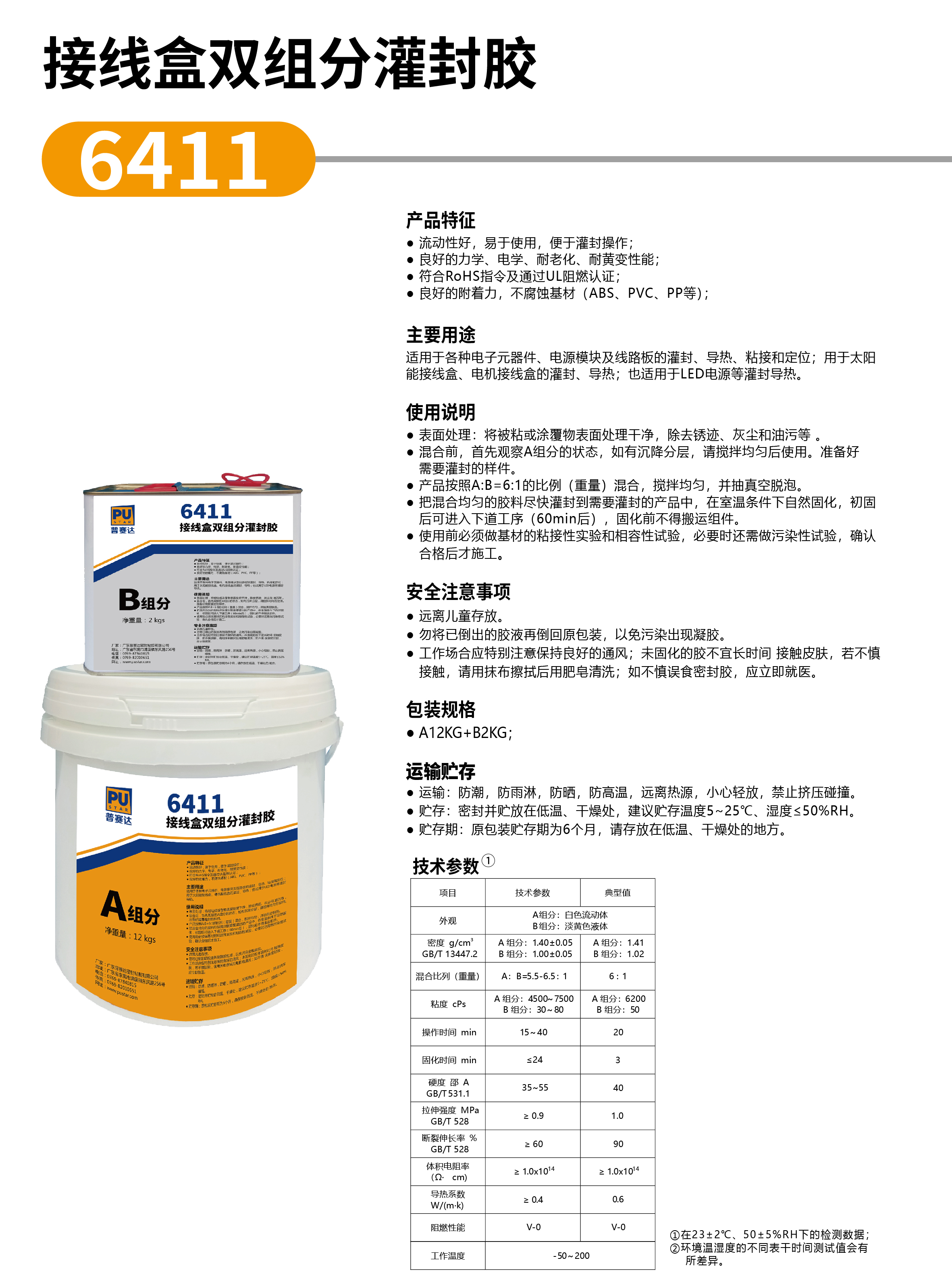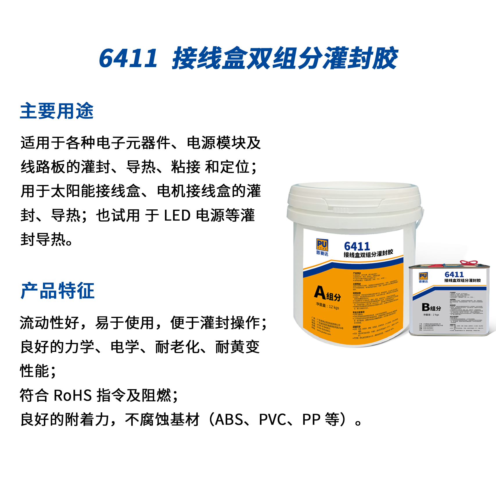 6411 是一種室溫固化的雙組分縮合型有機(jī)硅灌封膠,具備固化速度快、易流動灌封、耐黃變、防水防潮、絕緣性能優(yōu)異、粘接基材廣泛等特點(diǎn),適合用于光伏接線盒、集成電路板、變壓器、防水電源等大面積粘合的密封件澆注和灌封。
