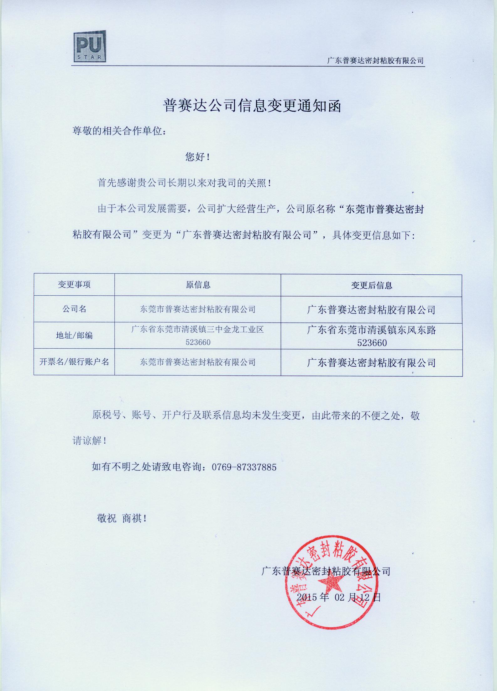 由于本公司發(fā)展需要,公司擴大經(jīng)營生產(chǎn),公司原名稱“東莞市普賽達密封粘膠有限公司”變更為“廣東普賽達密封粘膠有限公司”,具體變更信息如下: